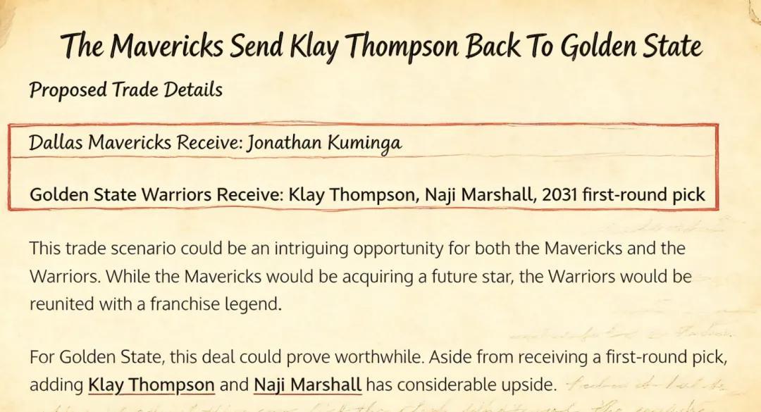 美媒《Fadeaway World》撰文建议,勇士可以将库明加送到达拉斯,换回克莱、马绍尔以及2031年的首轮签。