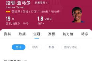 亚马尔在2023年4月29日巴萨4-0击败贝蒂斯的比赛中上演首秀,截至目前已为巴萨出战99场,贡献21球33助,个人德转身价也涨至1.8亿欧。